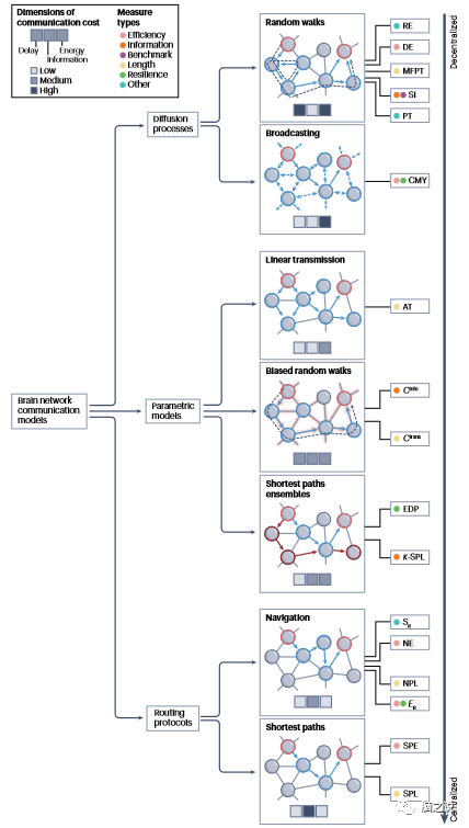 图2脑网络通信模型和措施的分类。当前的大脑网络通信模型可以分为三大类——扩散过程、参数模型和路由协议——从分散(上)到集中(下)策略。一个家族分为几个通信模型,每个模型都提出一个特定的策略或算法来引导网络节点之间的信号。一个模型的优劣可以根据通信成本的三个维度进行概念性评价:延迟、信息和能量。在这些方面的性能是用颜色标签表示的,表示低、中、高成本。给定模型的属性可以通过一系列通信度量来量化。根据量化神经通信的各个方面,如信号成本或恢复力,对测量方法进行分组和颜色编码。AT: 激活时间;五、信息成本; cmy传染性; Ctrams传输成本(相当于MFPT); DE:扩散效率; EDP,边缘不相交路径; 例如:效率比;k-SPL, k最短路径长度; MFPT,表示首次通过时间; NE,导航效率; NPL,导航路径长度; PT:路径传递性; RE,资源效率; SI,搜索信息; SPE,最短路径效率; SPL:最短路径长度; Sp,成功率。