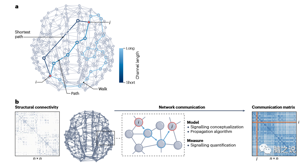 图1 脑网络通信模型的核心概念。人类连接组是由白质束(网络连接)相互连接的灰质区域(网络节点)组成的宏观连接网络。是什么原理指导信号通过复杂的大脑连接进行多突触传播? walk和paths是图论中的概念,描述了遍历网络的方式。walk被定义为一个连接序列,其中连续的连接对共享一个公共节点。遍历对节点和连接可以遍历的次数没有限制,构成了在网络中旅行的最不受约束的方法。路径是一种遍历,其中单个节点和连接只能遍历一次,因此不允许信号重新访问网络元素。a,人类连接体中路径和行走的例子。i区和j区之间的许多可能的通信通道的长度各不相同,索引了它们支持快速可靠信号的能力。最短路径是两个区域之间最有效的通道。b、网络通信建模。结构连接矩阵描述了n个神经元素之间的物理连接。它只直接对信息进行编码连接节点,因此通常是稀疏的。通信模型描述了一种通过结构连通性引导信号传播的策略。该模型确定了从节点i到节点j的路径(蓝色箭头)。通信度量量化了模型确定的路径的特征(例如,效率、成本和弹性),从而产生了从i到j的信令过程的假定特征。对每对元素进行计算,度量产生了一个通信矩阵,该矩阵是完全连接的。网络通信模型和度量可以在无向(双边连接)或有向(不对称连接)以及未加权(表明存在或不存在连接)或加权(表明连接强度)的结构网络中进行计算。对于某些模型,需要将连接权值转换为连接长度,以捕获遍历解剖链路的代价。
