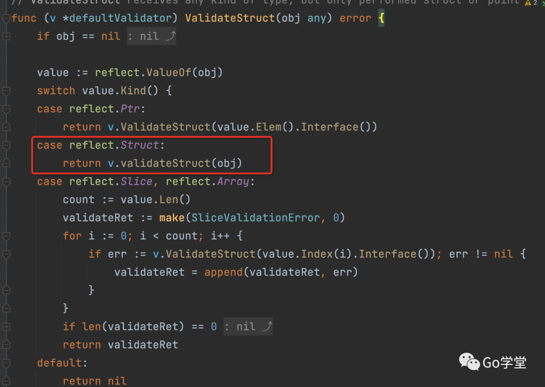 我们看到,当obj是结构体时就调用validateStruct函数,注意和ValidateStruct函数命名上的区别。在validateStruct函数中,又调用了defaultValidator中validate变量的Struct函数,也就是validator.Validate类型。这里的validate变量就又和问题1中注册校验函数和目标结构体中的对象关联起来了。