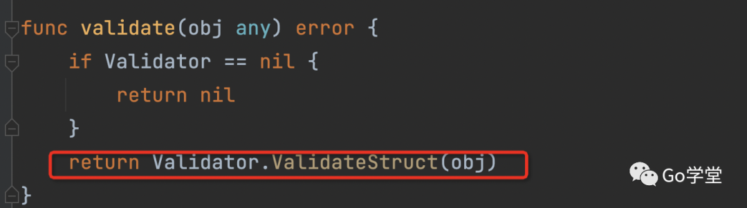 Validator就是在问题1中我们说的binding.Validator的变量,其值是defaultValidator类型,也就是说要调用该对象的ValidateStruct函数,如下: