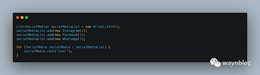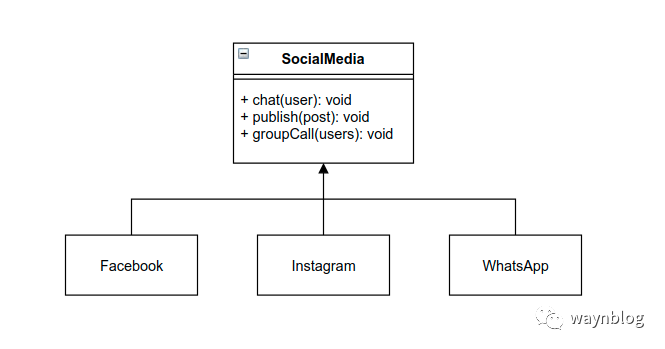 因此,SocialMedia 类有 3 个方法,分别称为 chat()、publish() 和 groupCall()。为了展现里氏替换原则(LSP)的作用,我将直接用 Facebook、Instagram、WhatsApp 3 个类来实现这一点。