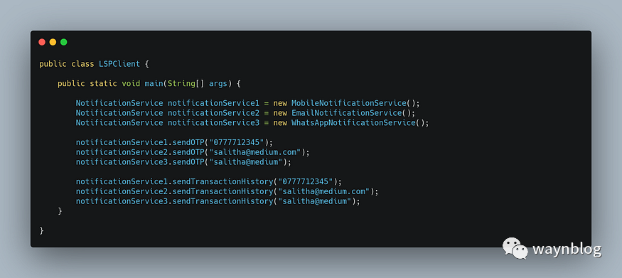 如果又有另一种类型的新媒介需要发送那会发生什么?我们只需要创建另一个服务,从 NotificationService 实现它并完成与新媒介相关的逻辑就行!