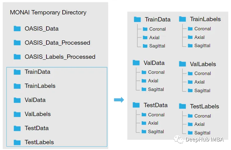 print(f"Training count: {len(train)}, Validation count: {len(val)}, Test count: {len(test)}")因为模型需要的是二维切片,所以将每个切片保存在不同的文件夹中,如下图所示。这两个代码单元将训练集的每个MRI体积的切片保存为“.png”格式。