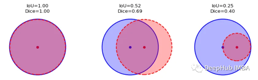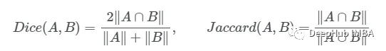 这一目标的两个相关但不同的指标是Dice和Intersection / Union (IoU)系数,后者也被称为Jaccard系数。两个指标都在0(无重叠)和1(完全重叠)之间。