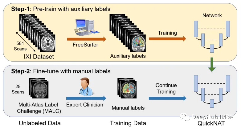 首先,使用现有的软件工具(例如FreeSurfer)从大型未标记数据集中获得自动生成的分割,然后使用这些工具对网络进行预训练。在第二步中,使用更小的手动注释数据[2]对网络进行微调。