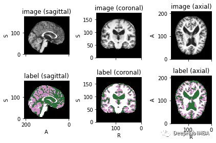files = [{'image': image_name, 'label': label_name} for image_name, label_name in zip(image_files, label_files)]为了可视化带有相应标签的图像,可以使用TorchIO,这是一个Python库,用于深度学习中多维医学图像的加载、预处理、增强和采样。