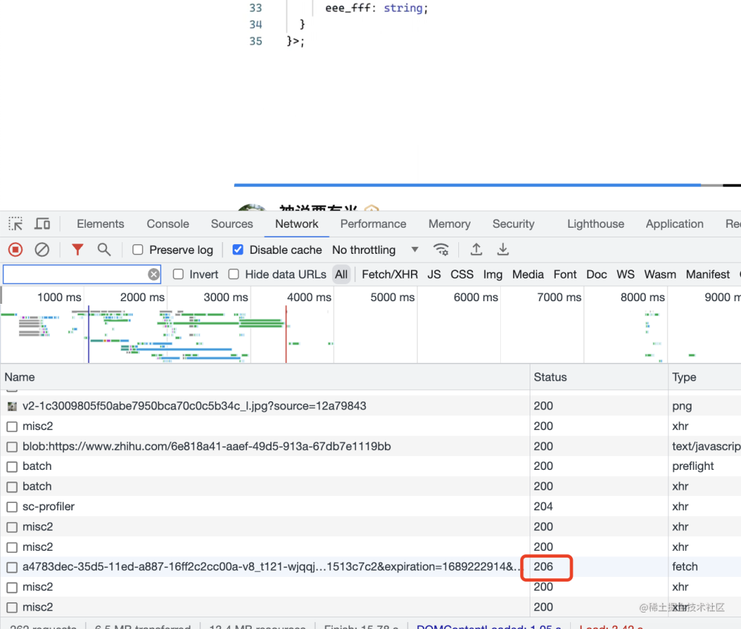然后打开 devtools,刷新页面,拖动下进度条,可以看到确实有 206 的状态码: