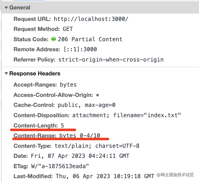 这里的 Content-Length 是当前内容的长度,而 Content-Range 里是资源总长度和当前资源的范围。