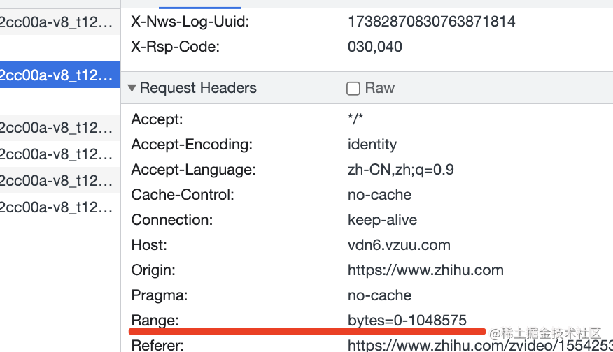 不过知乎没用这种格式,还是 mp4 存储的,这种就需要根据 range 来读取部分文件内容来返回了: