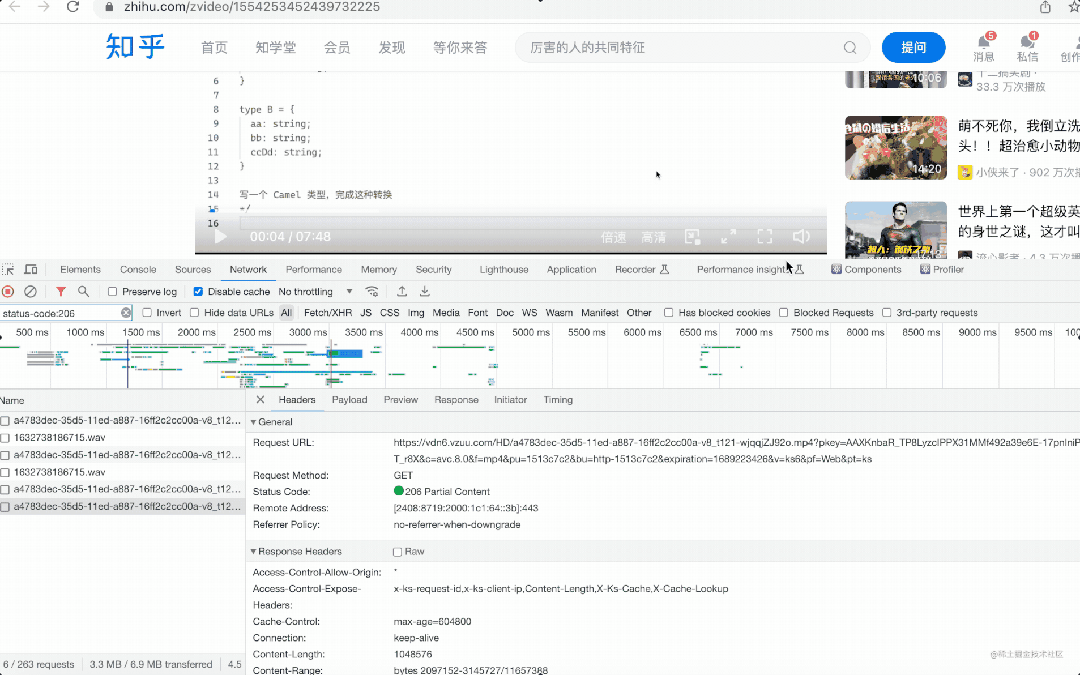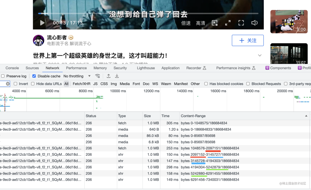 也就是说,知乎视频是通过 range 来请求部分视频片段,通过 SourceBuffer 动态播放这个片段,来实现的快速播放的目的。具体的分段是提前确定好的,会根据进度条来计算出下载哪个 range 的视频。