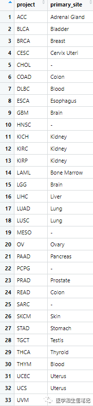 :mRNA和样本信息整合到一起的数据,行是样本,列是基因,前2列是sample_id和sample_typeTCGA和GTEx并不是一对一的关系,如下图所示(这个对应关系表可以在GEPIA网站免费下载),TCGA的很多project在GTEx里是没有对应的样本的,并且GTEx和TCGA是1对多的关系哦~