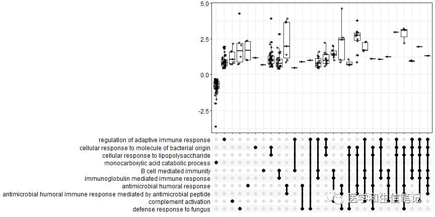 对于GSEA结果,除了展示不同条目间基因的交集外,还可以通过箱线图展示不同条目的倍数变化(foldchange):