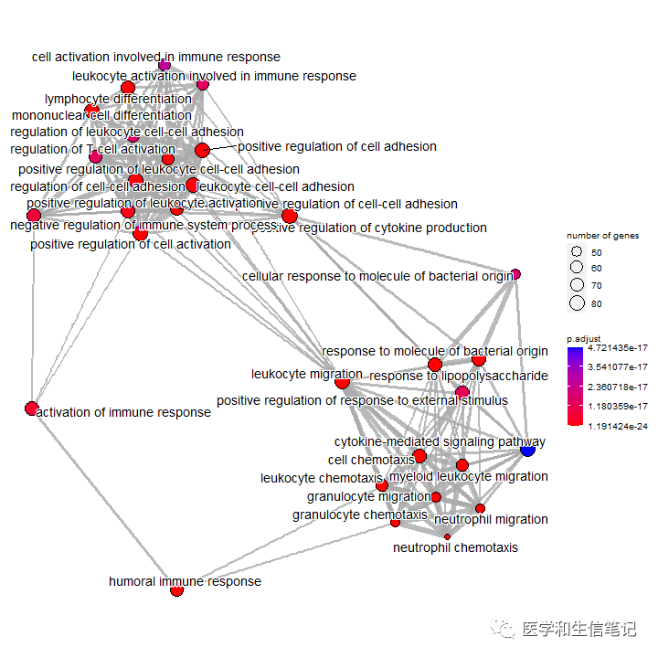 这个图形展示的信息有点类似emapplot网络图,可以通过聚类发现功能近似的条目,有利于发现功能模块。