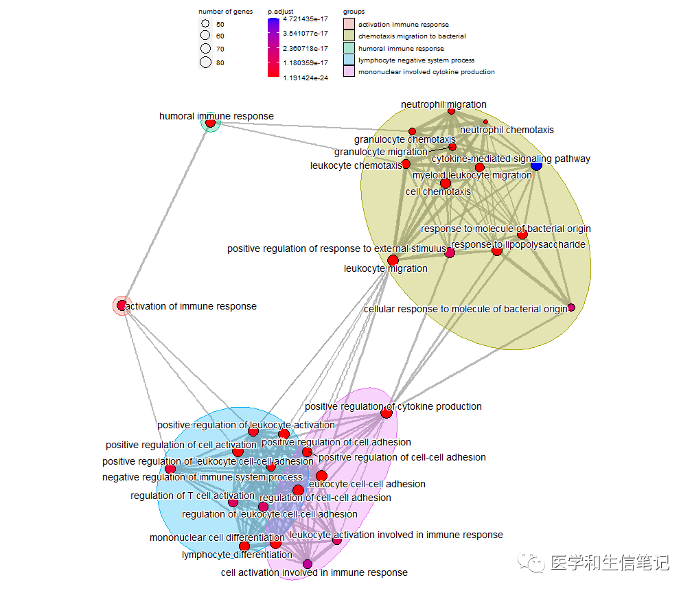 这张图就很有意思了,如果你用过cytoscape做过富集分析,那你一定对这种样式很熟悉。它给你增加了置信椭圆,一眼就能看出几个模块。
