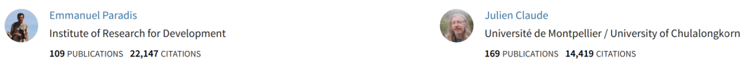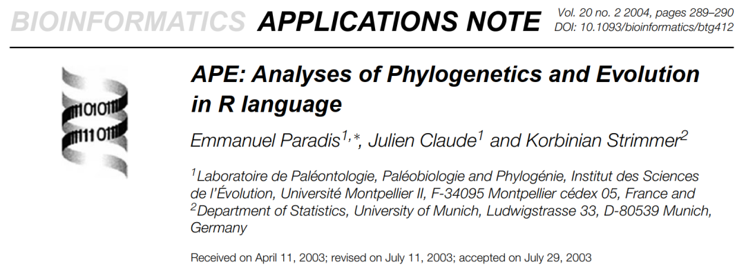 R的1个优点是,通过编写专门的包,可以很容易地针对特定应用领域进行定制(Tailored to a particular application area)。特别是,R在生物信息学中的有用性已经在基因表达数据(即转录组)的分析中得到了令人印象深刻的证明(http://www.bioconductor.org)。APE是首次在系统发育和进化数据的分析中发挥R的优势。APE专注于使用系统发育和系谱(Genealogical)树作为输入的统计分析。