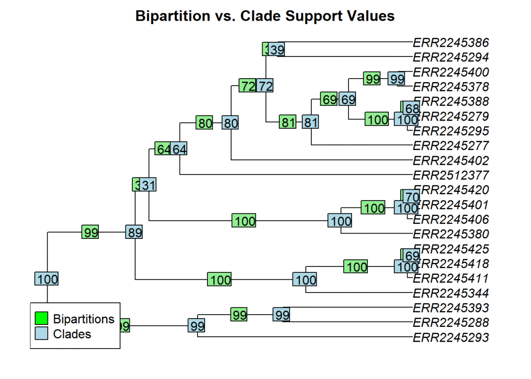 legend("bottomleft", legend = c("Bipartitions", "Clades"), pch = 22,