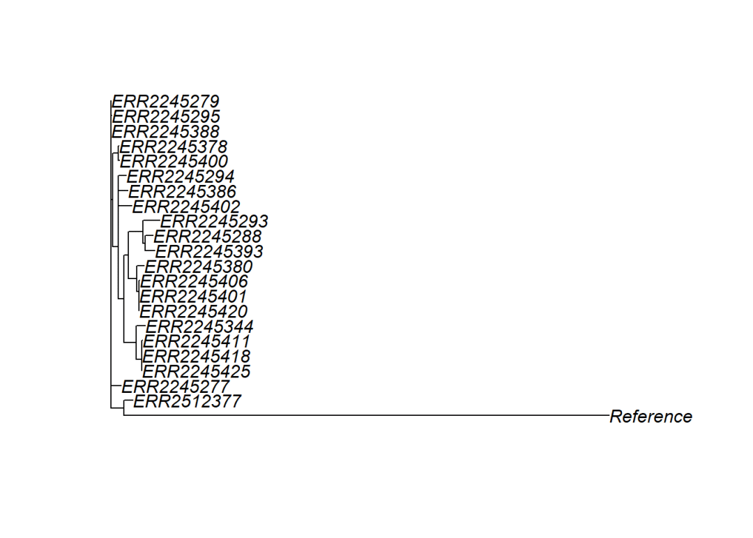 tree1 <- read.tree('tree1.txt')这会将系统进化树存储在名为"tree1"的类(Class)'phylo'对象中。该对象中存储的信息(e.g. 分枝长度)可通过输入`tree1`(命令)来检查,并且可通过执行以下(命令),来获得进化分枝图(Cladogram)形式的图形输出: