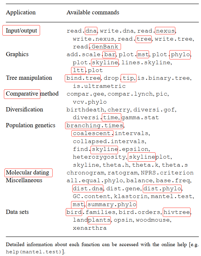 表1概述了APE中目前可用的函数。注意,有些方法 (如比较法、天际线图/Skyline plot等) 以前只能在专门的软件中使用。外部的树重建程序(如PHYLIP)可以通过标准的Shell命令从R调用。