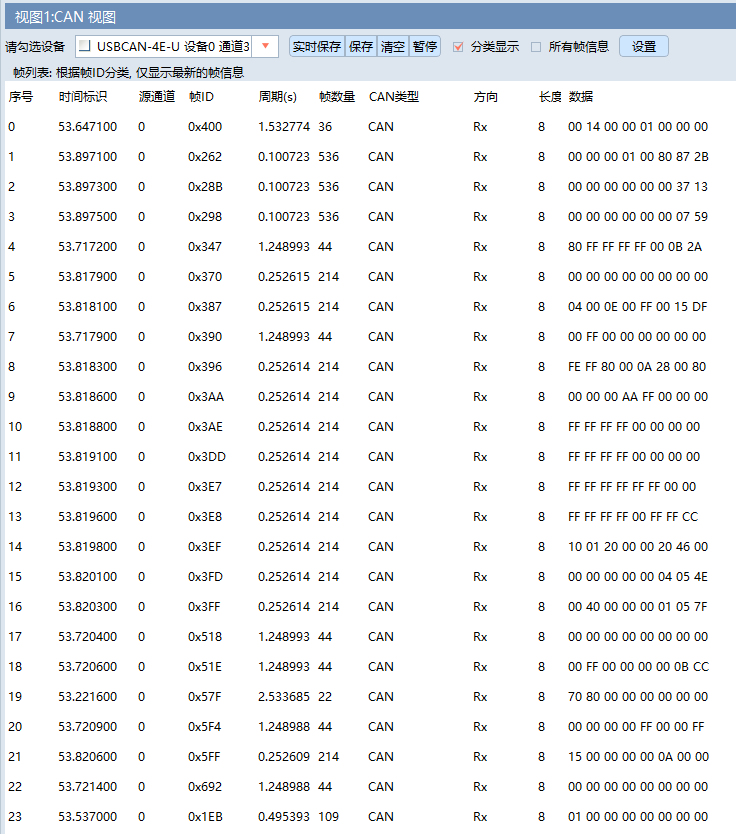 将其和CAN总线分析仪建立连接后,启动BCM电源,即可查看BCM发出的CAN报文,如图7所示。