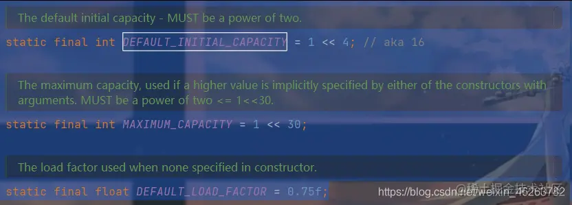可以看到桶的初始容量默认为16,值得注意的是,桶的初始容量和扩容后的容量必须是 2n,所以桶的最大容量就是230,即 1 << 30