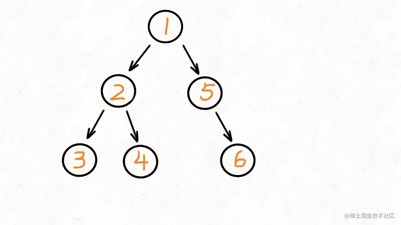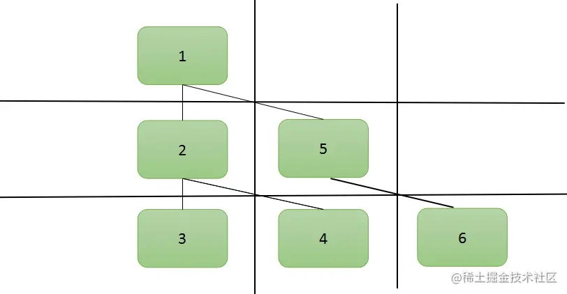 按照深度优先的处理顺序,会先访问节点 1,再访问节点 2,接着是节点 3。之后是第二列的 4 和 5,最后是第三列的 6。