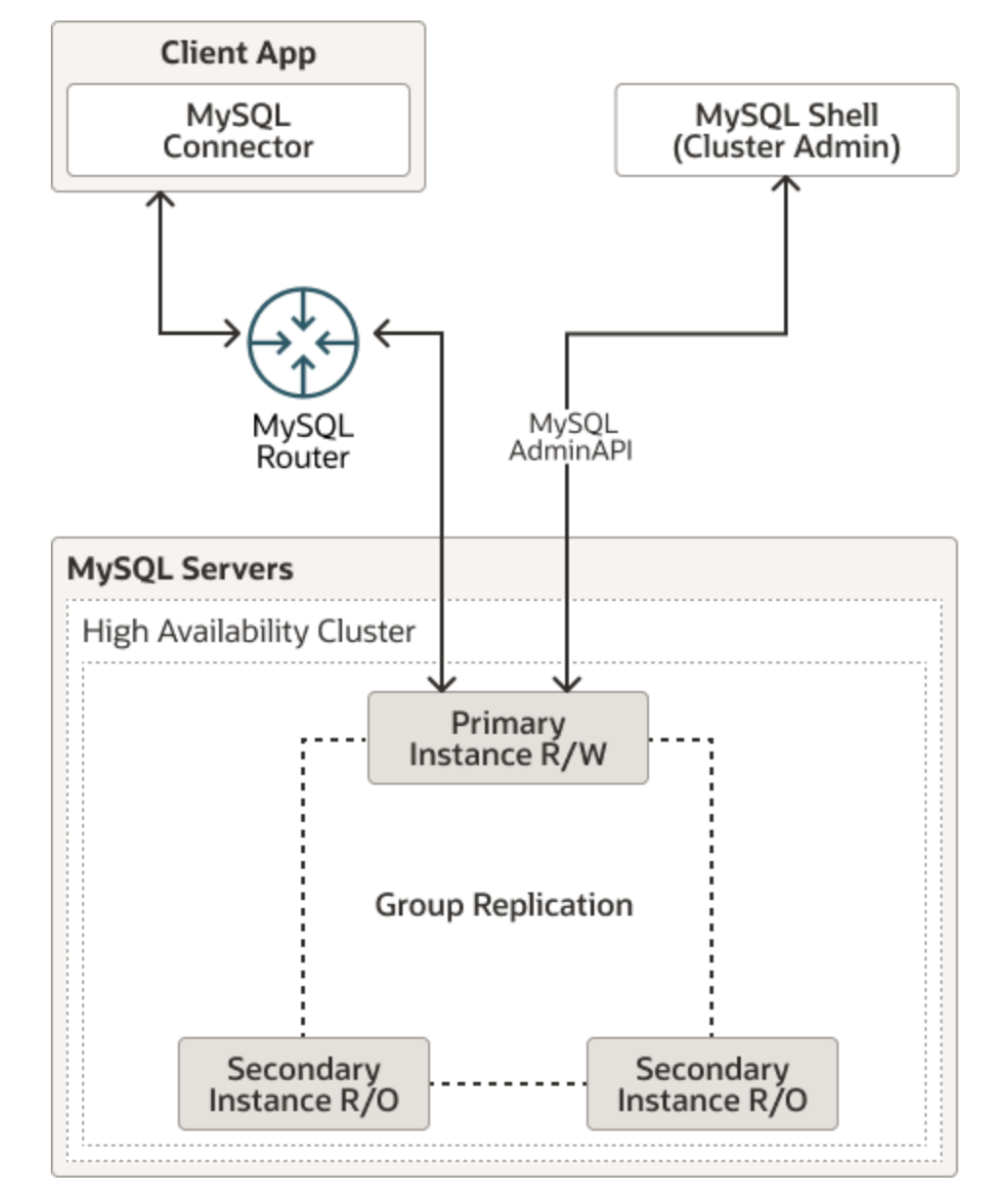 MySQL Shell 8.1与MySQL 8.1 同日发行,在这个创新版里,MySQL Shell推出了一个新的功能——MySQL InnoDB Cluster Read Replicas,为InnoDB Cluster增加了只读副本。通过该功能,用户可以分散集群的工作负载,将数据的读取从InnoDB Cluster分散到一个或多个只读副本上,并为InnoDB Cluster提供额外的数据副本。这同样也是MySQL的一个高可用性方案,该架构的示意图如下: