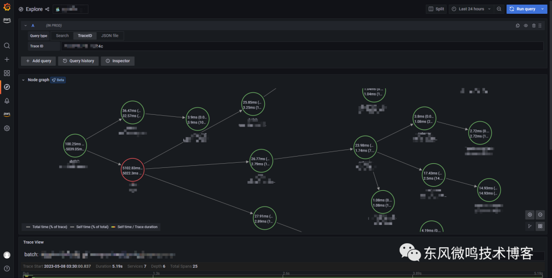 点击后, 会直接跳转到 Explore -> Jaeger 页面, 并带有出错的 trace_id, 同时显示链路拓扑和 trace 瀑布图, 如下图: