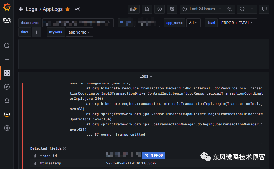 之后, 可以通过ES 日志快速搜索仪表板[4], 筛选出ERROR 日志, 点击展开 details, 会发现 trace_id 会带一个跳转链接, 如下图: