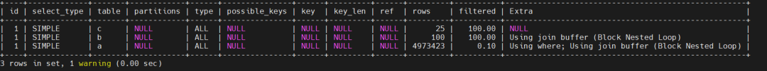 优化器选择先对两个小表c,b进行关联,然后得到的结果集再与大表a进行关联,因为语句中c,b两个表没有字段进行直接关联,所以这两个表连接后的结果集是一个笛卡尔积25 *100=2500,因为大表的关联字段上没有索引,所以需要对最内层的大表全表扫描2500次。
