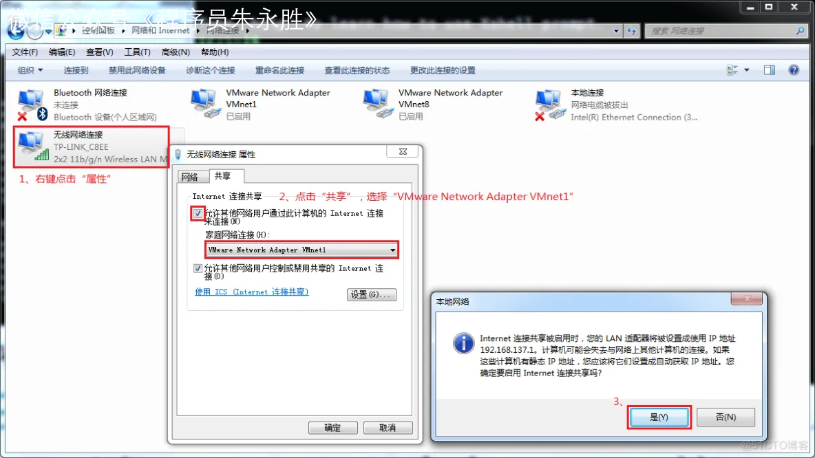 通过上图,我们可以发现,如果要使得虚拟机能联网,我们可以将主机网卡共享给 VMware Network Adapter VMnet1 网卡,从而达到虚拟机联网的目的。接下来,我们就来测试一下。