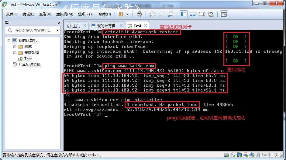 重启网卡,然后通过远程工具测试能否联通外网以及与主机通信。