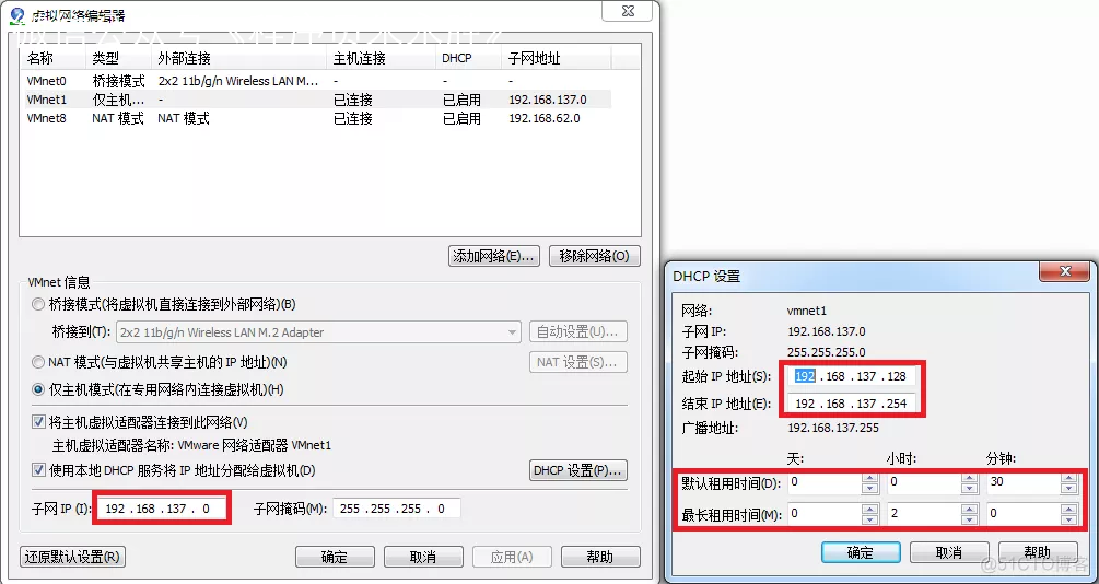 我们可以看到上图有一个提示,强制将 VMware Network Adapter VMnet1 的 ip 设置成 192.168.137.1,那么接下来,我们就要将虚拟机的 DHCP 的子网和起始地址进行修改,点击“虚拟网络编辑器”