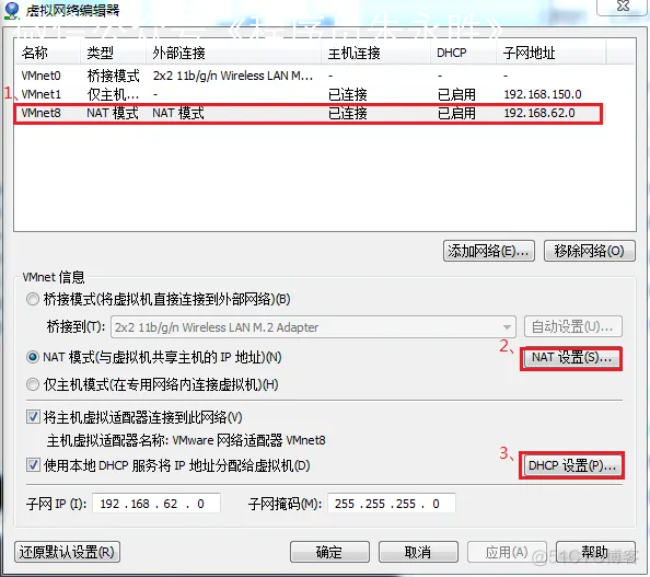 那么,这就是 NAT 模式,利用虚拟的 NAT 设备以及虚拟 DHCP 服务器来使虚拟机连接外网,而 VMware Network Adapter VMnet8 虚拟网卡是用来与虚拟机通信的。
