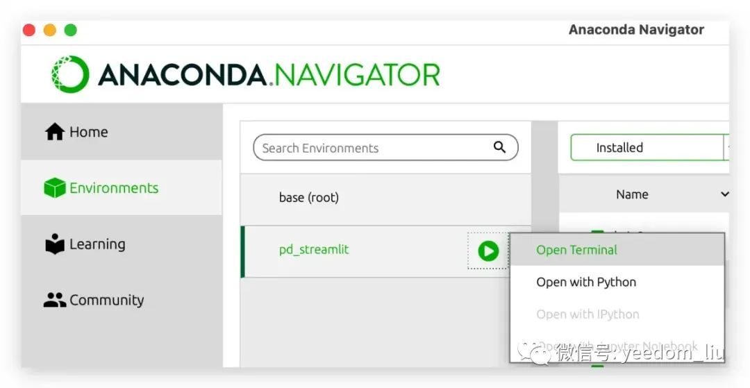 选择你刚刚创建的虚拟环境,在虚拟环境名称旁边会显示一个▶标志,选择它。当显示出▶标志后,会显示一个菜单,选择“Open Terminal”。