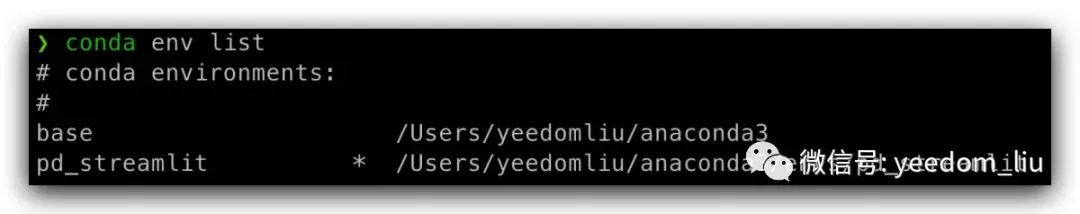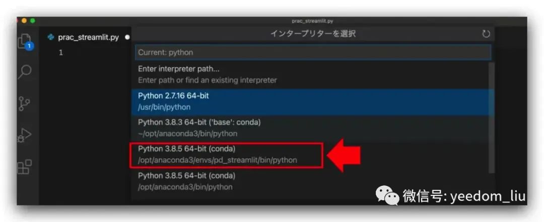 打开VS Code的终端后,让我们确保Python的执行环境已经设置为之前创建的虚拟环境。确认的方法是,在打开的VS Code终端中输入以下命令,然后按下Enter键。星号(*)标记显示为活动状态。