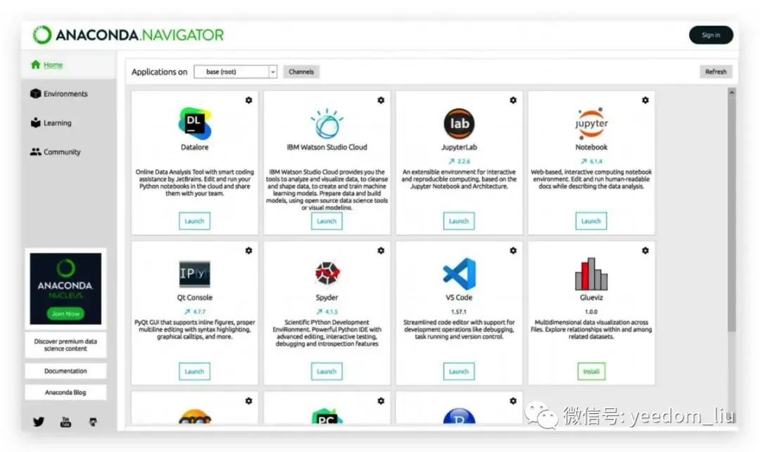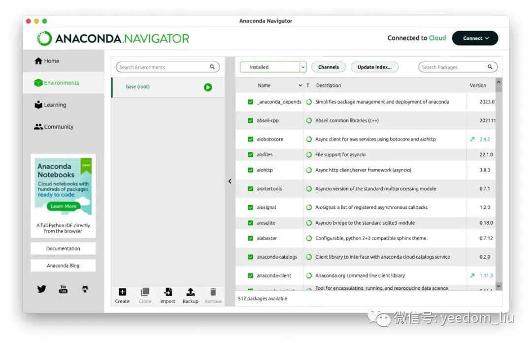 启动Anaconda-Navigator,选择左侧菜单栏的“Environments”,可以查看所有的虚拟环境项目。