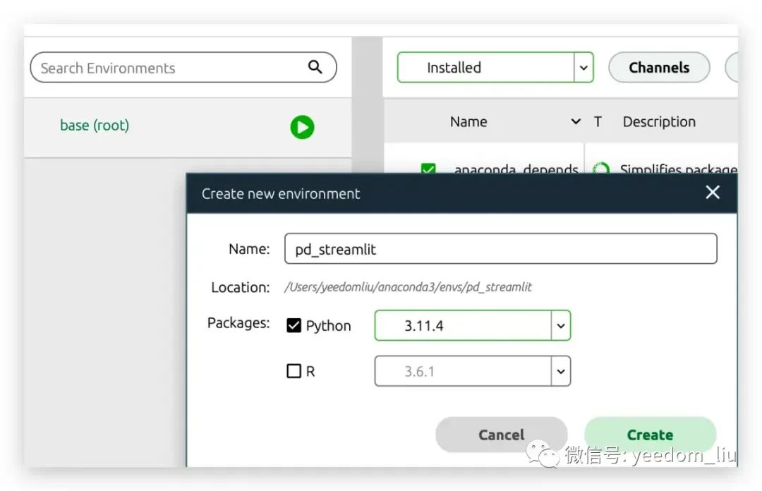接着打开一个名为“Create new environment”的页面,你可以在“Name”栏输入虚拟环境的名称。在本书中,我们将其命名为“pd_streamlit”。然后选择要使用的编程语言,选择“Python”,选择“3.8”版本。