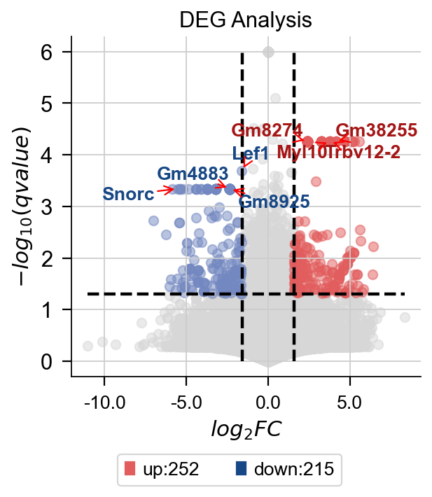 ['Gm8925','Snorc']plot_genes互斥,如果我们没有指定需要绘制的基因,可以自动绘制前n个高差异表达倍数的基因。此外,我们还可以指定绘制的颜色等,具体的参数可以使用help(dds.plot_volcano)来查看