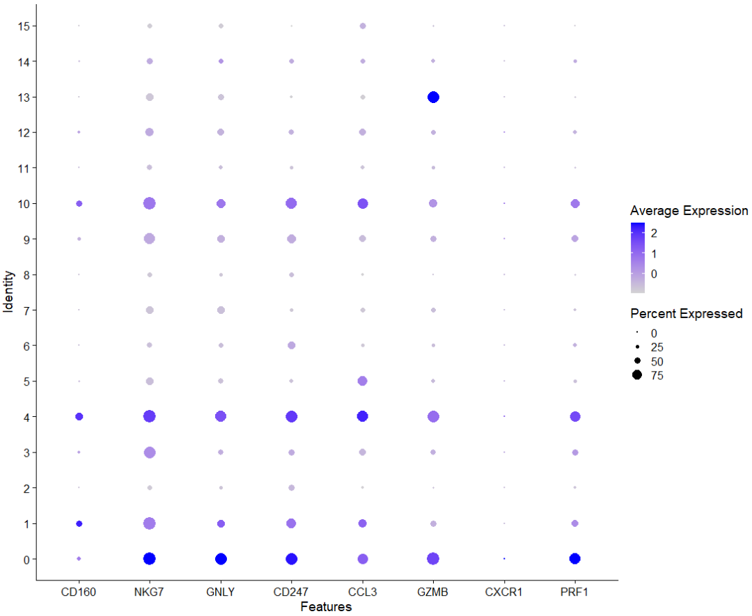 DotPlot(sce,features = c('CD160','NKG7','GNLY','CD247','CCL3','GZMB','CXCR1','TYOB','PRF1'))
