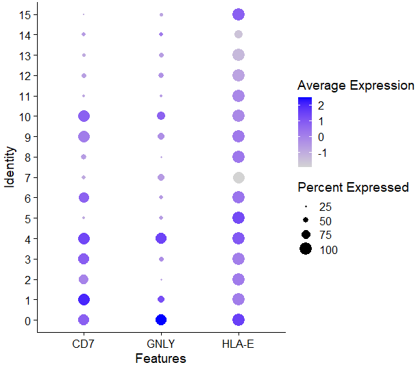 DotPlot(sce,features = c('CD16','CD57','CD7','GNLY','GZM8','HLA-E','NGK7'))