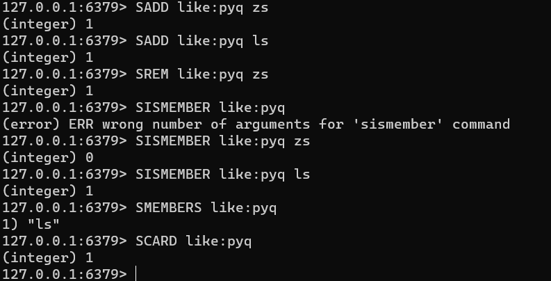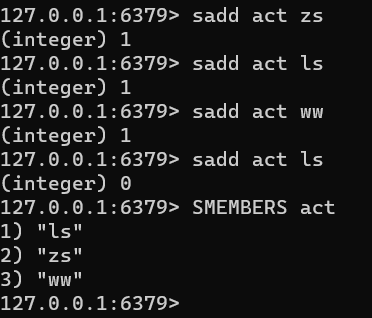 Set会自动去重,比如抽奖的情况下,防止用户重复抽奖,如图可以看到,李四sadd了两次,但是并没有成功,用SMEMBERS 可以看到所有用户。