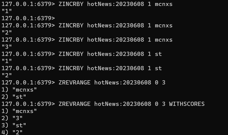 ZINCRBY hotNews:20230608 1 mcnxs 代表明朝那些事被用户点击了一次。