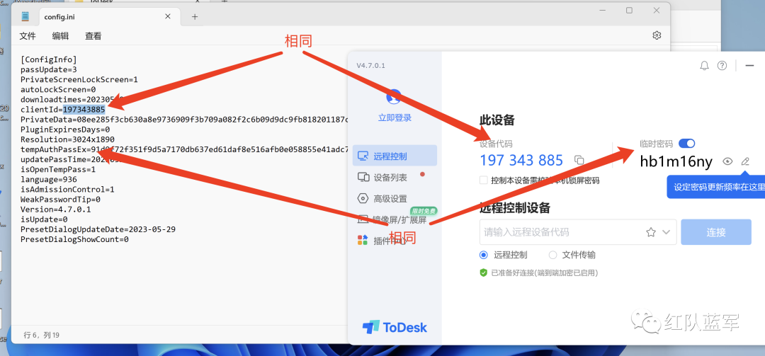 这里咱们可以攻击机安装todesk,然后读取到config.ini中的配置文件,然后和攻击机进行替换即可。这里我虚拟机假装是受害机,读取出来,然后攻击机把tempauthpassex进行替换。