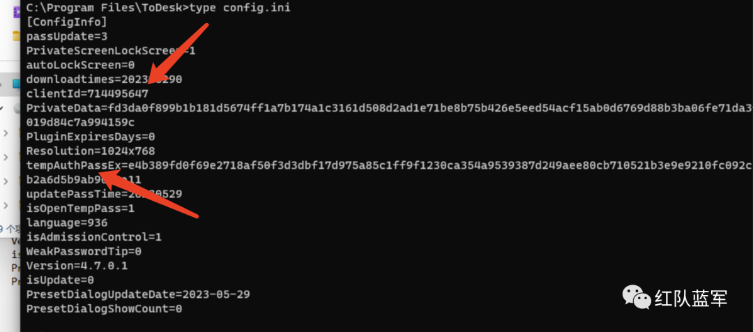 这里还是和前面的向日葵一样,可以进行配置文件的窃取,这里的默认安装路径(C:\Program Files\ToDesk\config.ini)