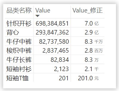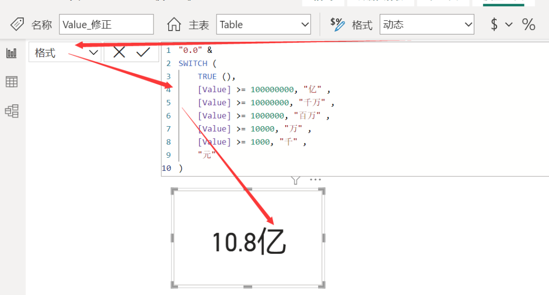 )针对该度量值施加动态格式(不了解动态格式参考此文:Power BI 动态格式的奇葩用法),单位即可按照数据自行切换了。