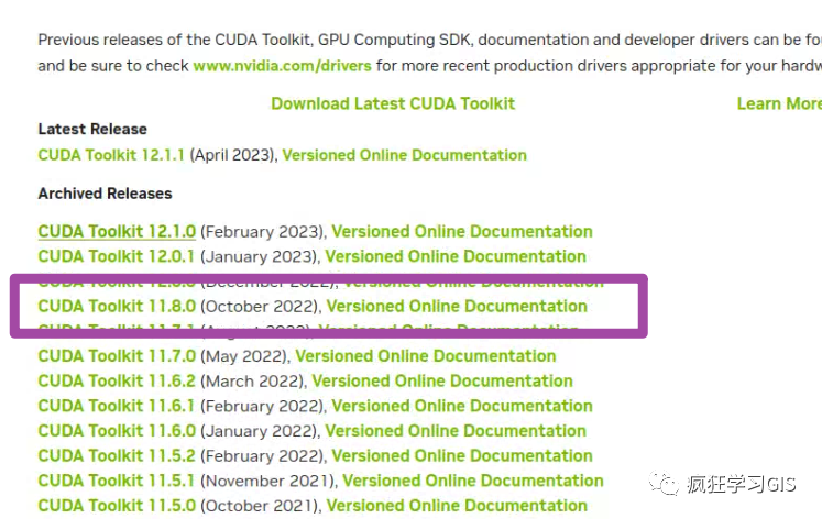 如下图所示,我们这里找到11.8版本的CUDA,点击即可。