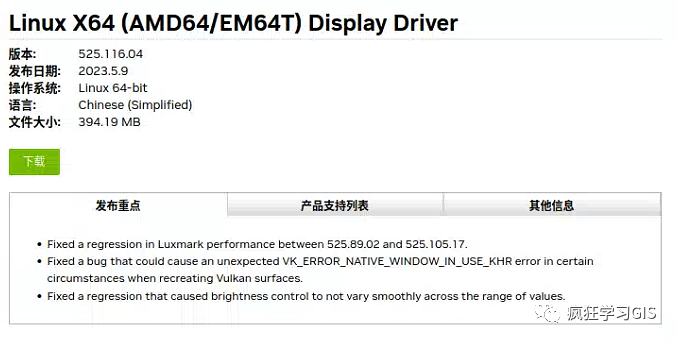 但此时,和前文中不一样的是,或许可以看到出现recommended的NVIDIA驱动程序版本发生了变化,例如我这里不再是前面的525了,而是另一个版本;但是这里我们不用管这个变化,之后还是下载525版本即可。