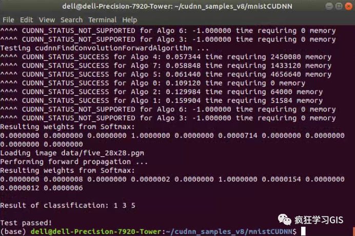 如果大家运行完上述代码后,得到如下图所示的结果,出现Test passed!这个字样,就表明我们的cuDNN也已经配置完毕。