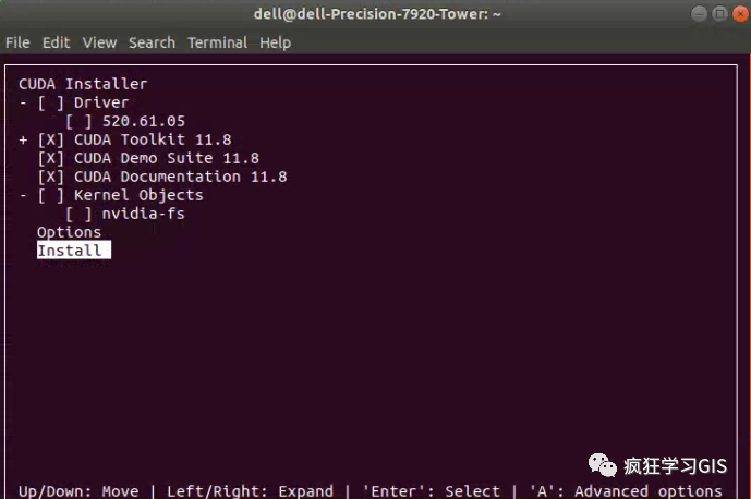 随后,大家要注意,在如下图所示的界面中,取消选中Driver前面的叉号,从而取消NVIDIA驱动程序的安装,因为我们已经在前面安装过这个驱动了。随后,即可选择“Install”。