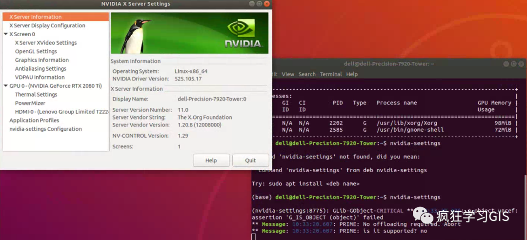 如果出现如下图所示的情况,即一个新的名为“NVIDIA X Server Settings”的窗口被打开,即说明我们前述的配置没有问题。